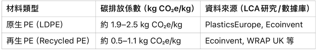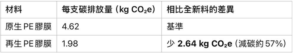 Virgin PE: 2.1 kg CO₂e/kg Recycled PE: 0.9 kg CO₂e/kg